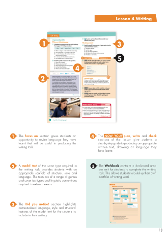 4 The NOw YOu! plan, write and check sections of the lesson give students a step-by-step guide to producing an appropriate written text, drawing on language they have learnt.