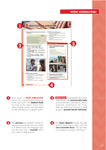 1 Each lesson in NOw ANDALuSIA! follows the communicative framework of the main units in the Student’s Book focusing on the region. Topics have been carefully chosen and developed to reflect Andalusia in a global context.