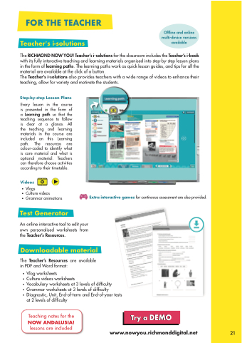 The RICHMOND NOw YOu! Teacher’s i-solutions for the classroom includes the Teacher’s i-book with its fully interactive teaching and learning materials organised into step-by-step lesson plans in the form of learning paths. The learning paths work as quick lesson guides, and tips for all the material are available at the click of a button.