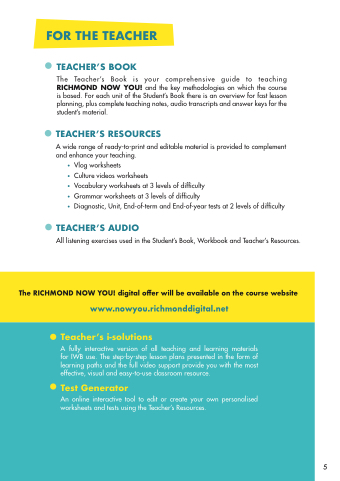 The Teacher’s Book is your comprehensive guide to teaching RICHMOND NOW YOU! and the key methodologies on which the course is based. For each unit of the Student’s Book there is an overview for fast lesson planning, plus complete teaching notes, audio transcripts and answer keys for the student’s material.