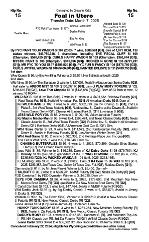 By PYC PAINT YOUR WAGON SI 107 (2003). 7 wins, $889,581 [G1]. Sire of 1,071 ROM, 130 stakes winners, $43,750,348, 3 champions, including THE FISCAL CLIFF SI 109 (Champion, $580,425 [G1]), CURLS HAPPY WAGON SI 103 (Champion, $360,674 [G1]), MYSTIC PAINT SI 103 (Champion, $341,856 [G3]), HOOKED N GONE SI 106 ($791,231 [G1]), MR PYC TO YOU SI 97 ($488,820 [G1]), PYC FUN N FANCY SI 104 ($478,760 [G3]), CURLS JOYFUL WAGON SI 100 ($466,005 [G1]), PAINTED ECLISPE SI 111 ($455,753 [G2]).