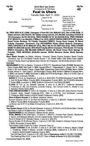 Owners Futurity, Sand Cup Barrels Day 2 Senior 2D Champion. Her first foals arrived in 2024.