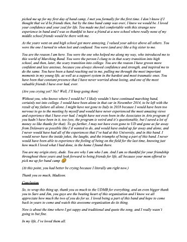 Without you, who knows where I would be? I likely wouldn’t have continued marching band, certainly not into college. I would have been alone in that car in November 2014, to be left with the result of my failure all alone. I might have not gone to Italy in 2018 because I would have been too nervous to go to the meeting by myself and would have never experienced the most amazing views and experience that I have ever had. I might have not even been in the Associates in Arts program if you hadn’t have been in it, too (yes, the program is weird and it’s questionable, but I saved a lot of money so like thanks for that). To go further, I may not have even gone to UD and gone as far away from Delaware as possible like I’d wanted to do, and would have ended up far away and alone, and I never would have had all of the experiences that I’ve had at this University, and in this band. I would never have the inside jokes, the laughs, and the triumphs of being a part of this band. I never would have been able to experience the feeling of being on the field for the last time, knowing just how much I loved what I had done, in the home I found there.
