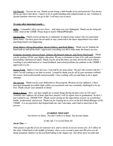 Heidi I. Sarver – Sarv, you have taught me so many things during my four years at UD, and I certainly can’t address all of them right here (maybe I will try again close to graduation). So here I just wanted to say, THANK YOU. Thank you for giving me the opportunity to grow as a performer, leader, professional, and person. Thank you for trusting me to serve as the first Band Manager of the UDMB – it is an experience that helped make me who I am today, and I had so much fun in the process.