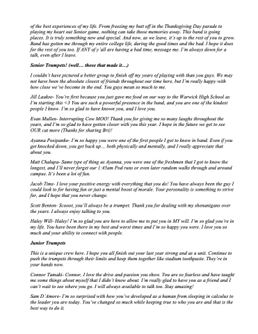 of the best experiences of my life. From freezing my butt off in the Thanksgiving Day parade to playing my heart out Senior game, nothing can take those memories away. This band is going places. It is truly something new and special. And now, as we leave, it’s up to the rest of you to grow. Band has gotten me through my entire college life, during the good times and the bad. I hope it does for the rest of you too. If ANY of y’all are having a bad time, message me. I’m always down for a talk, even after I leave.