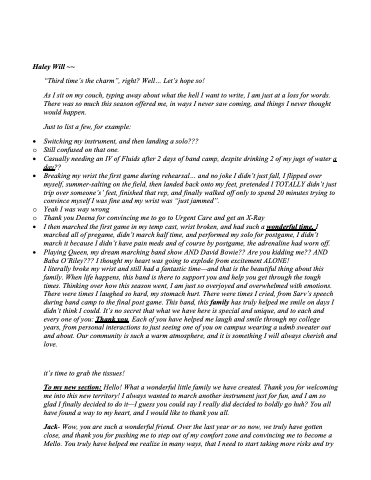 To my new section: Hello! What a wonderful little family we have created. Thank you for welcoming me into this new territory! I always wanted to march another instrument just for fun, and I am so glad I finally decided to do it—I guess you could say I really did decided to boldly go huh? You all have found a way to my heart, and I would like to thank you all.