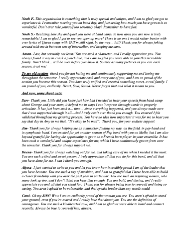 Noah F.-This organization is something that is truly special and unique, and I am so glad you got to experience it. I remember meeting you on band day, and just seeing how much you have grown is so wonderful. Don’t ever take yourself too seriously okay? Remember to have fun!