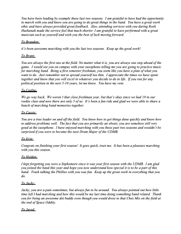 You have been leading by example these last two seasons. I am grateful to have had the opportunity to march with you and know you are going to do great things in the band. You have a great work ethic and have always provided great feedback. Also, attending services with you during Rosh Hashanah made the service feel that much shorter. I am grateful to have performed with a great musician such as yourself and wish you the best of luck moving forward.