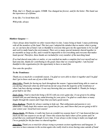 I have always done band for no other reason than it is fun. I enjoy being at band; I enjoy performing with all the members of the band. This last year I adopted the mindset that no matter what is going on, we can have fun at band. I am so thankful to everyone that gave me the opportunity to be on staff and work to make band a fun environment. There are so many special moments shared together in an ensemble as large as this, and it would be impossible to list everything and everyone that makes band special. Therefore, these thanks are included for every member of the marching band.