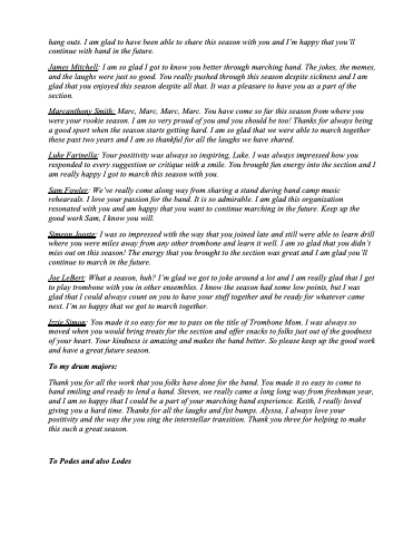 Luke Farinella: Your positivity was always so inspiring, Luke. I was always impressed how you responded to every suggestion or critique with a smile. You brought fun energy into the section and I am really happy I got to march this season with you.