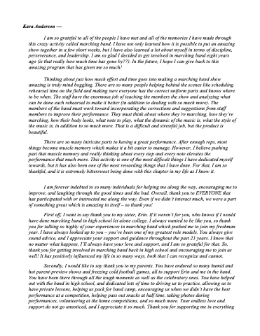 Secondly, I would like to say thank you to my parents. You have endured so many humid and hot parent-preview shows and freezing cold football games, all to support Erin and me in the band. You have been there through all the tough moments as well as the celebratory ones. You have helped out with the band in high school, and dedicated lots of time to driving us to practice, allowing us to have private lessons, helping us pack for band camp, encouraging us when we didn’t have the best performance at a competition, helping pass out snacks at half time, taking photos during performances, volunteering at the home competitions, and so much more. Your endless love and support do not go unnoticed, and I appreciate it so much. Thank you for supporting me in everything