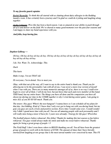 Okay, with that out of the way, all I want to say to the entire band is thank you. Thank you for allowing me to be the personality I am with all of you. I was never a more true version of myself when I was with you. There are so many memories amongst all of us, there is no way I could even begin to cover all of them. I will do my best, but just know that each and every member of this band, THIS band, has my entire heart. The things you have all done and the compassion you have all shown me during our time in the UDMB together is why I cried during senior game. I am going to miss ALL of you SO SO SO much. Thank you.