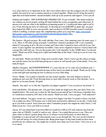 Alyssa: If I was asked back in my first DMA if I would be a DM at UD with someone else from the same class at UMASS, I would’ve said no way. Alyssa, I’m so glad that person is you. There are times when we haven’t gotten along, but we’ve always recovered because we know that our friendship is so special and will transcend the years we go through life. You were my first friend at UD, and will always be a dear friend in life. Being drum major in this band would not have been possible for me without you. You taught me so much, more than you’ll ever know. I love you so so so so so much.