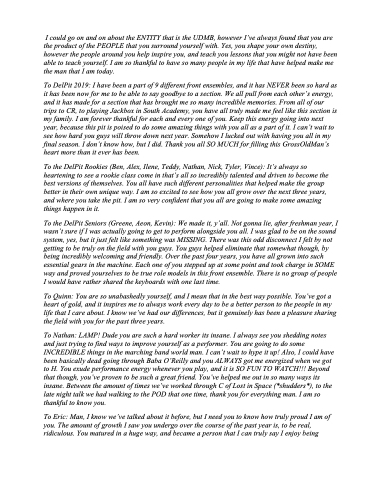 To DelPit 2019: I have been a part of 9 different front ensembles, and it has NEVER been so hard as it has been now for me to be able to say goodbye to a section. We all pull from each other’s energy, and it has made for a section that has brought me so many incredible memories. From all of our trips to CR, to playing Jackbox in South Academy, you have all truly made me feel like this section is my family. I am forever thankful for each and every one of you. Keep this energy going into next year, because this pit is poised to do some amazing things with you all as a part of it. I can’t wait to see how hard you guys will throw down next year. Somehow I lucked out with having you all in my final season. I don’t know how, but I did. Thank you all SO MUCH for filling this GrossOldMan’s heart more than it ever has been.