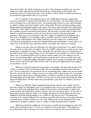 Next, I would like to those that have been in the UDMB with me that have enhanced my experience and made it so special. First off, thank you to my big Emily. I am SO grateful to have met you my freshman year in the clarinet section. You instantly made me feel so at ease, and you helped me adjust to college and being a member of this college band. We had so much fun goofing around during rehearsal and playing together in the stands. I miss those times and will forever cherish them! Furthermore, I don’t think I would have had as much fun if I switched to mello by myself and didn’t have a buddy to learn the instrument along with me. That first music sectional when we didn’t even know how to hold the instrument will be one of my favorite memories of my marching band experience. That season was so much fun, and I am so happy we bonded more through that. Since then, I am so thankful for your friendship, support, and advice that you’ve given me throughout college. I truly cannot imagine what college would have been like without you, so thank you for believing in me and giving me so much love through all the good and bad times. I cannot wait to see what we do in the next few years, and I know that we will remain close wherever we end up!