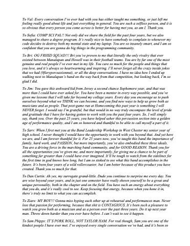 To Jim: You gave this awkward kid from Jersey a second chance Sophomore year, and that was more than I could have ever asked for. You have been a mentor in every way possible, and you’ve given me lessons that I will take far beyond my college years. Every day you encourage us to push ourselves beyond what we THINK we can become, and you find new ways to help us grow both as musicians and as people. That post-game run at Homecoming this past year is something I will NEVER forget. I would say I’m grateful, but that would in no way truly encompass the level of pride and gratitude that I have for having gotten to work with you the past four years. So, I will simply say, thank you. Over the past 25 years, you have helped usher this percussion section into a golden age of performance quality, and I am so honored and thankful to be able to call myself a part of it.