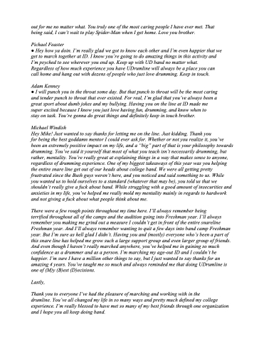 ● Hey how ya doin. I’m really glad we got to know each other and I’m even happier that we get to march together at ID. I know you’re going to do amazing things in this activity and I’m psyched to see wherever you end up. Keep up with UD band no matter what. Regardless of how much experience you have UDrumline will always be a place you can call home and hang out with dozens of people who just love drumming. Keep in touch.