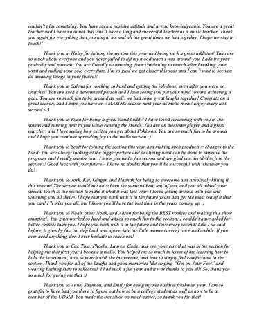 Thank you to Cat, Tina, Phoebe, Lauren, Catie, and everyone else that was in the section for helping me that first year I became a mello. You helped me so much in terms of me learning how to hold the instrument, how to march with the instrument, and how to simply feel comfortable in the section. Thank you for all of the laughs and good memories like singing “Get on Your Feet” and wearing bathing suits to rehearsal. I had such a fun year and it was thanks to you all! So, thank you so much for giving me that :)
