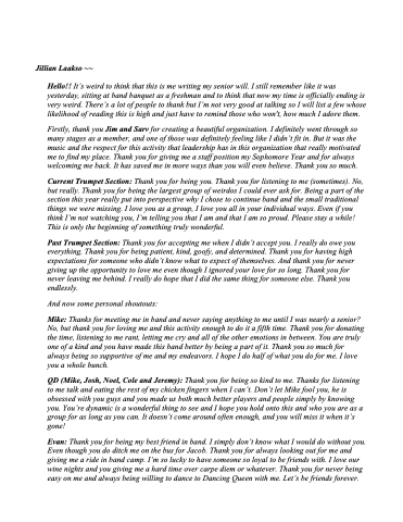 Hello!! It’s weird to think that this is me writing my senior will. I still remember like it was yesterday, sitting at band banquet as a freshman and to think that now my time is officially ending is very weird. There’s a lot of people to thank but I’m not very good at talking so I will list a few whose likelihood of reading this is high and just have to remind those who won't, how much I adore them.