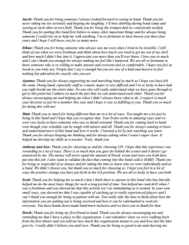 Jacob: Thank you for being someone I always looked forward to seeing in band. Thank you for never taking me too seriously and keeping me laughing. I’ll miss dabbing during band camp and waving at each other across field. Thank you for being the trumpet dad we consistently needed. Thank you for putting this band first before so many other important things and for always being someone I could rely on to help me with anything. I’m so fortunate to have known you these four years and I hope I will know you for so many more.