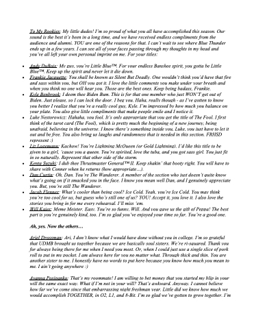 To My Rookies: My little dudes! I’m so proud of what you all have accomplished this season. Our sound is the best it’s been in a long time, and we have received endless compliments from the audience and alumni. YOU are one of the reasons for that. I can’t wait to see where Blue Thunder ends up in a few years. I can see all of your faces passing through my thoughts in my head and you’ve all left your own personal imprint on me. For your titles: