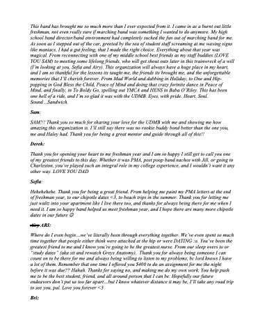 This band has brought me so much more than I ever expected from it. I came in as a burnt out little freshman, not even really sure if marching band was something I wanted to do anymore. My high school band director/band environment had completely sucked the fun out of marching band for me. As soon as I stepped out of the car, greeted by the sea of student staff screaming at me waving signs like maniacs, I had a gut feeling, that I made the right choice. Everything about that year was magical. From reconnecting with one of my middle school best friends as my staff buddies (LOVE YOU SAM) to meeting some lifelong friends, who will get shout outs later in this trainwreck of a will (I’m looking at you, Sofia and Airy). This organization will always have a huge place in my heart, and I am so thankful for the lessons its taught me, the friends its brought me, and the unforgettable memories that I’ll cherish forever. From Mad World and dabbing in Holiday, to One and Hip- popping in God Bless the Child, Peace of Mind and doing that crazy fortnite dance in Peace of Mind, and finally, in To Boldy Go, spelling out YMCA and HENS in Baba O’Riley. This has been one hell of a ride, and I’m so glad it was with the UDMB. Eyes, with pride. Heart. Soul. Sound...Sandwich.