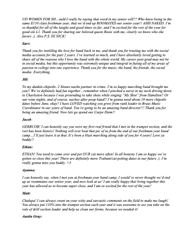 To my dunkin-chipotle- 2 Stones nacho partner in crime: I’m so happy marching band brought me you!! We’ve definitely had fun together...remember when I pinched a nerve in my neck driving down to Charleston because I was pretending to take shots while singing “My Shot” from Hamilton? Or our wine nights, and of course, nachos after poop band!! I’m gonna need about 18 more chipotle dates before June, okay? I have LOVED watching you grow from rank leader to Brass Music Coordinator in our years of band. You’re going to be an amazing band director!!! Thank you for being an amazing friend. Now lets go spend our Carpe Diem!!