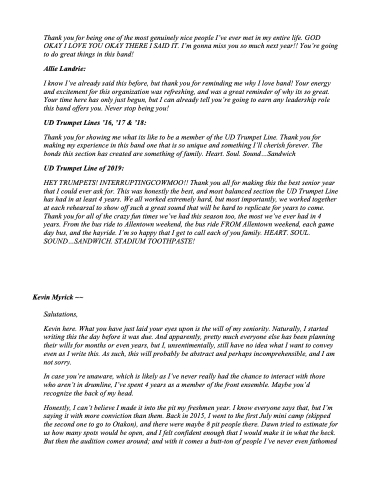 HEY TRUMPETS! INTERRUPTINGCOWMOO!! Thank you all for making this the best senior year that I could ever ask for. This was honestly the best, and most balanced section the UD Trumpet Line has had in at least 4 years. We all worked extremely hard, but most importantly, we worked together at each rehearsal to show off such a great sound that will be hard to replicate for years to come. Thank you for all of the crazy fun times we’ve had this season too, the most we’ve ever had in 4 years. From the bus ride to Allentown weekend, the bus ride FROM Allentown weekend, each game day bus, and the hayride. I’m so happy that I get to call each of you family. HEART. SOUL. SOUND...SANDWICH. STADIUM TOOTHPASTE!