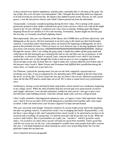 I don’t really remember what happened sophomore year, so I guess it wasn’t that important. Junior year, I had to borrow my dad’s drill to help Raman put a marimba back together after some tragic accident. I didn’t do band senior year because I figured I’d study abroad instead.
