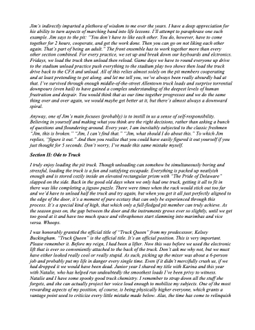 Jim’s indirectly imparted a plethora of wisdom to me over the years. I have a deep appreciation for his ability to turn aspects of marching band into life lessons. I’ll attempt to paraphrase one such example. Jim says to the pit: “You don’t have to like each other. You do, however, have to come together for 2 hours, cooperate, and get the work done. Then you can go on not liking each other again. That’s part of being an adult.” The front ensemble has to work together more than every other section combined. For every practice, we set up and break down our keyboards and elctronics. Fridays, we load the truck then unload then reload. Game days we have to round everyone up drive to the stadium unload practice push everything to the stadium play two shows then load the truck drive back to the CFA and unload. All of this relies almost solely on the pit members cooperating and at least pretending to get along. and let me tell you, we’ve always been really absurdly bad at that. I’ve survived through enough middle-of-the-street Allentown truck loads and surprise torrential downpours (even hail) to have gained a complex understanding of the deepest levels of human frustration and despair. You would think that as our time together progresses and we do the same thing over and over again, we would maybe get better at it, but there’s almost always a downward spiral.