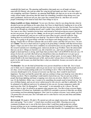 Emma Leefeldt and Jenny Armistead: I’m not sure Jim knew what he was doing that day when he decided to put me and Emma at the same drum, but I have to thank him for leading me to two of the most amazing people and to two people who have become two of my best friends. You two have been here for me through my rebuilding myself, and I couldn’t have asked for anyone more supportive. You came to me when I needed a person most, and instead of God answering my prayers and giving me just one person, He gave me two. Jenny: you do not give yourself nearly enough credit. You are a smart and talented girl, and you are worth way more than you give yourself credit for. Stop looking down on yourself and keep your head up. You deserve better than you allow yourself to have. You’re going to do great things with that vocal degree and change people’s lives with music therapy. People like us will have someone like you in their corner, and that will save lives, I’m sure of it. Emma: You are so smart and you’re going to do great thing’s someday with that neuroscience degree. I hope you start to have more confidence in yourself because you are gonna be amazing. Do the research and discover something great. And if you decide to go PreMed, I have the utmost faith that you can do it. Things are hard for you, life is hard for you , and I am so proud that you have fought so hard and been so strong, and I hope that you know that I will ALWAYS be here for you. I’ll always be here for you both. But both of you should know that you should never ever give up on anything, because there is always a chance that things will get easier, in every aspect. Both of you: mental health is the most important part of life, and you don’t always have to be alone in it. Don’t push it to the side because you think that that is what you should do, because you need to take care of yourselves.