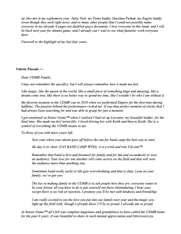 an Alto dot in my sophomore year, Julia Turk, my Tento buddy, Darshan Pathak, my Eagles buddy (even though they suck right now), and so many other people that I could not possibly name everyone in my already 6 pages not doubled space document. I love everyone in this band, and I will be back next year for alumni game, and I already can’t wait to see what fantastic work everyone does.