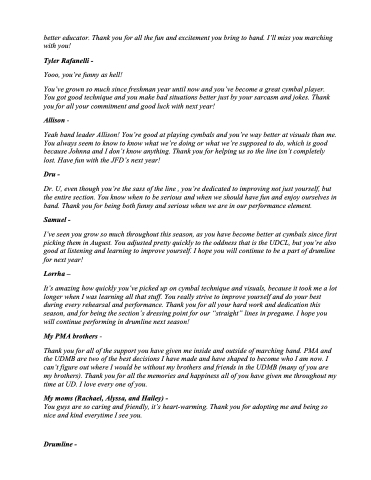 Thank you for all of the support you have given me inside and outside of marching band. PMA and the UDMB are two of the best decisions I have made and have shaped to become who I am now. I can’t figure out where I would be without my brothers and friends in the UDMB (many of you are my brothers). Thank you for all the memories and happiness all of you have given me throughout my time at UD. I love every one of you.