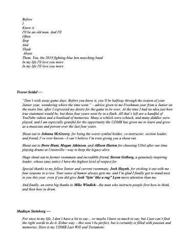 “Don’t wish away game days. Before you know it, you’ll be halfway through the season of your Junior year, wondering where the time went.” – advice given to me Freshman year from a Junior on the snare line, after I expressed my desire for the game to be over. At the time I had no idea just how true statement would be, but these four years went by in a flash. All that’s left are a handful of YouTube videos and a boatload of memories. Many a schtick were schtuck, and many diddles were played, and I am especially grateful for the opportunity the UDMB has given me to learn and grow as a musician and person over the last four years.