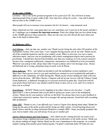 Juniors (Salena Iapeno and Josh Pompeo) – Josh, thank you for coming back for my senior year! You always bring a lighthearted spirit and strong sense of adventure to the mello section. Thank you for always making me laugh. Salena, thank you for your commitment to this program. As a transfer student coming from another great band program, I’m glad I could help make UD home for you.