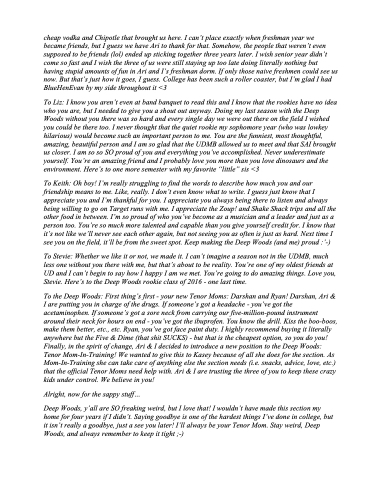 To Stevie: Whether we like it or not, we made it. I can’t imagine a season not in the UDMB, much less one without you there with me, but that’s about to be reality. You’re one of my oldest friends at UD and I can’t begin to say how I happy I am we met. You’re going to do amazing things. Love you, Stevie. Here’s to the Deep Woods rookie class of 2016 - one last time.
