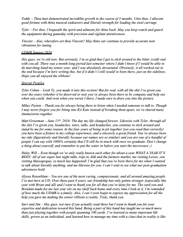 Sarv and Jim – Hey guys, not sure if you actually read these but I want to thank you for your expertise and dedication toward this band. Being a part of this band has taught me so much more than just playing together with people spanning 100 yards. I’ve learned so many important life skills, grown as an individual, and learned how to manage my time with a class that in reality is like