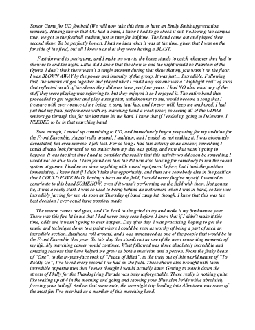 Fast-forward to post-game, and I make my way to the home stands to catch whatever they had to show us to end the night. Little did I know that the show to end the night would be Phantom of the Opera. I don’t think there wasn’t a single moment during that show that my jaw wasn’t on the floor. I was BLOWN AWAY by the power and intensity of the group. It was just... Incredible. Following that, the seniors all got together and played what I could only assume was a “highlight reel” of sorts that reflected on all of the shows they did over their past four years. I had NO idea what any of the stuff they were playing was referring to, but they enjoyed it so I enjoyed it. The entire band then proceeded to get together and play a song that, unbeknownst to me, would become a song that I treasure with every ounce of my being. A song that has, and forever will, keep me anchored. I had just had my final performance with my marching band a week prior, so seeing all of the UDMB seniors go through this for the last time hit me hard. I knew that if I ended up going to Delaware, I NEEDED to be in that marching band.