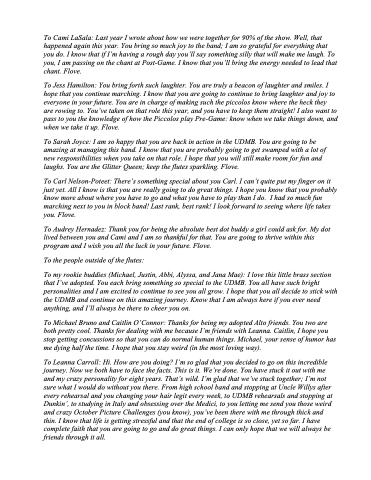 To Jess Hamilton: You bring forth such laughter. You are truly a beacon of laughter and smiles. I hope that you continue marching. I know that you are going to continue to bring laughter and joy to everyone in your future. You are in charge of making such the piccolos know where the heck they are rowing to. You’ve taken on that role this year, and you have to keep them straight! I also want to pass to you the knowledge of how the Piccolos play Pre-Game: know when we take things down, and when we take it up. Flove.
