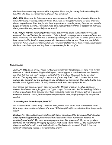 June 12th, 2012. Short, stout, 14 year old Brendan waltzes into the High School band room for the first time to “check this marching band thing out,” chewing gum, a couple minutes late. Brendan, you idiot. Spit that out, you’re going to get told off for it in about 30 seconds by the assistant director. That’s going to be your first impression of marching band. Yeah, it seemed harsh, even militant. The gum isn’t hurting anybody. You’re not playing an instrument. What a dumb, little thing to make such a big deal about. Oh well, better just stick it out and hope for the best.