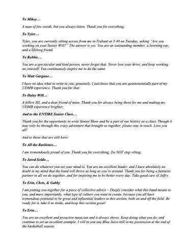 Thank you for the opportunity to write Senior Show and be a part of our history as a class. Though it may only be through this crazy adventure that brought us together, please stay in touch. Love you all!