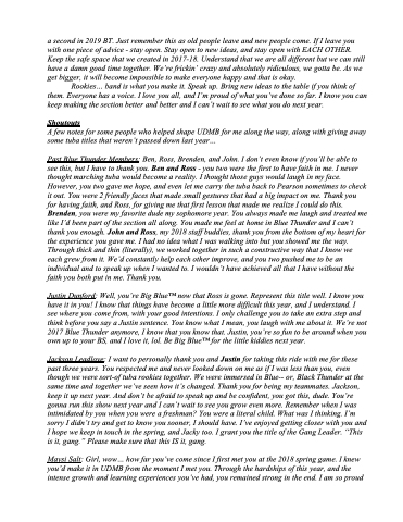 Past Blue Thunder Members: Ben, Ross, Brenden, and John. I don’t even know if you’ll be able to see this, but I have to thank you. Ben and Ross - you two were the first to have faith in me. I never thought marching tuba would become a reality. I thought those guys would laugh in my face. However, you two gave me hope, and even let me carry the tuba back to Pearson sometimes to check it out. You were 2 friendly faces that made small gestures that had a big impact on me. Thank you for having faith, and Ross, for giving me that first lesson that made me realize I could do this. Brenden, you were my favorite dude my sophomore year. You always made me laugh and treated me like I’d been part of the section all along. You made me feel at home in Blue Thunder and I can’t thank you enough. John and Ross, my 2018 staff buddies, thank you from the bottom of my heart for the experience you gave me. I had no idea what I was walking into but you showed me the way. Through thick and thin (literally), we worked together in such a constructive way that I know we each grew from it. We’d constantly help each other improve, and you two pushed me to be an individual and to speak up when I wanted to. I wouldn’t have achieved all that I have without the faith you both put in me. Thank you.