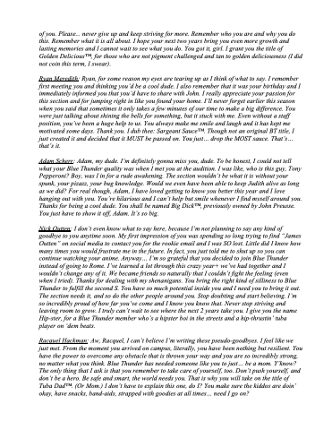 Nick Outten: I don’t even know what to say here, because I’m not planning to say any kind of goodbye to you anytime soon. My first impression of you was spending so long trying to find “James Outten” on social media to contact you for the rookie email and I was SO lost. Little did I know how many times you would frustrate me in the future. In fact, you just told me to shut up so you can continue watching your anime. Anyway... I’m so grateful that you decided to join Blue Thunder instead of going to Rome. I’ve learned a lot through this crazy year+ we’ve had together and I wouldn’t change any of it. We became friends so naturally that I couldn’t fight the feeling (even when I tried). Thanks for dealing with my shenanigans. You bring the right kind of silliness to Blue Thunder to fulfill the second S. You have so much potential inside you and I need you to bring it out. The section needs it, and so do the other people around you. Stop doubting and start believing. I’m so incredibly proud of how far you’ve come and I know you know that. Never stop striving and leaving room to grow. I truly can’t wait to see where the next 2 years take you. I give you the name Hip-ster, for a Blue Thunder member who’s a hipster boi in the streets and a hip-thrustin’ tuba player on ‘dem beats.