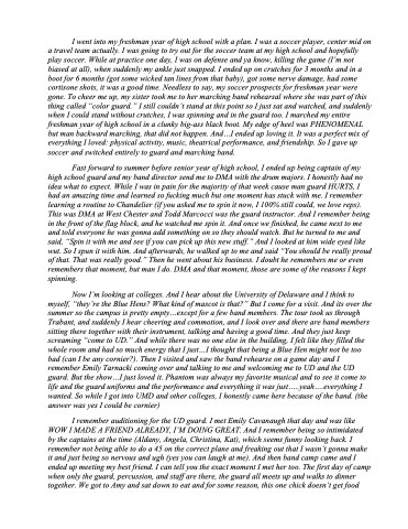 Now I’m looking at colleges. And I hear about the University of Delaware and I think to myself, “they’re the Blue Hens? What kind of mascot is that?” But I come for a visit. And its over the summer so the campus is pretty empty...except for a few band members. The tour took us through Trabant, and suddenly I hear cheering and commotion, and I look over and there are band members sitting there together with their instrument, talking and having a good time. And they just keep screaming “come to UD.” And while there was no one else in the building, I felt like they filled the whole room and had so much energy that I just...I thought that being a Blue Hen might not be too bad (can I be any cornier?). Then I visited and saw the band rehearse on a game day and I remember Emily Tarnacki coming over and talking to me and welcoming me to UD and the UD guard. But the show...I just loved it. Phantom was always my favorite musical and to see it come to life and the guard uniforms and the performance and everything it was just.....yeah....everything I wanted. So while I got into UMD and other colleges, I honestly came here because of the band. (the answer was yes I could be cornier)