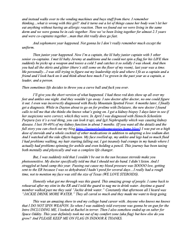 Then junior year happened. Now I’m a captain, the lil baby junior captain with 3 other senior co-captains. I met lil baby Jeremy at auditions and he could not spin a flag for his LIFE then suddenly he picks up a weapon and tosses a cold 5 and catches it so solidly I was shook. And then you had all the skirts and glitter (there’s still some on the floor of my room), last year was a time. Me personally...I was still trying to figure out my leadership style and where I fit as a captain and a friend and I look back on it and think about how much I’ve grown in the past year as a captain, a leader, and a person.