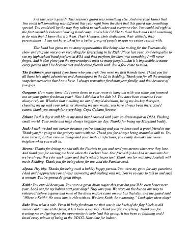 Rah: Wow what a ride. From lil baby freshman me that was in the back of the flag block to old senior captain me at the front, it has been a journey. Thank you for everything. Thank you for trusting me and giving me the opportunity to help lead this group. It has been so fulfilling and I loved every minute of being in the UDCG. Now time for indoor.
