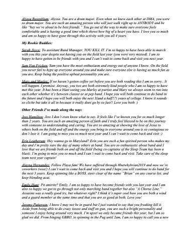 Alyssa Rosenblum: Alyssa. You are a drum major. Even when we knew each other at DMA, you were so drum major. You are such an amazing person who will just walk right up to ANYBODY and be like “hey we’re about to be best friends.” You go out of the way to make sure everyone feels comfortable and is having a good time which shows how big of a heart you have. I love you so much and am so happy to have gone through this activity with you all 4 years.