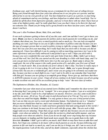 I remember last year when most of you started (sorry Holden) and I remember the sheer terror I felt in knowing that I was going to be an “example” for a new group of rookies. I was at a weird place in my life, and I didn’t want to be a bad influence on anyone. However, you ALL came in full force and blew me away. All of you. You all came in and showed most of us Vets up! You were a rookie class that was small but mighty. Holden: I’ve only gotten to know you over a brief period of time, but I can see that you are such a sweet and wholesome human. You helped me out in a “situation” that you never should have had too, and it sure seemed like you didn’t even think twice about it. Always stay that kind, because we really need more genuinely kind and caring people in this world. I hope you continue to do band, because you fit in well with this group. Alec: You are such a little nugget and you are amazing. I hope that you go out for staff one day because you are an excellent leader, even when not asked to. You lead within the section in a kind and subtle manner, and you help people even when not asked to. Even if you do not do staff, never stop being that way because you are fantastic in leading and this band needs more people like you to guide them in the right direction. Brandon: I didn’t get to talk to you much, and I think we may have been at odds here and there, but I hope you continue to do music with as much passion as you do, because following your passion in life can lead to so much joy, and I can see the joy it brings you. AJ: I am so sorry at all the stupid questions I ask all the time, and all my dumb comments, especially about the chicken hat,