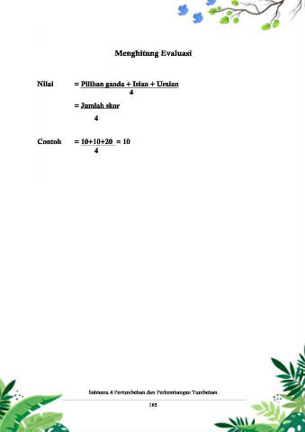 Menghitung Evaluasi Nilai = Pilihan ganda + Isian + Uraian 4 = Jumlah skor 4 Contoh = 10+10+20 = 10 4 Subtema 4 Pertumbuhan dan Perkembangan Tumbuhan 185