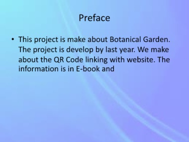 Preface • This project is make about Botanical Garden. The project is develop by last year. We make about the QR Code linking with website. The information is in E-book and